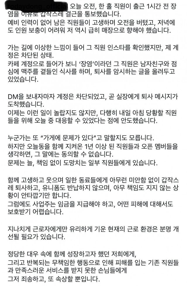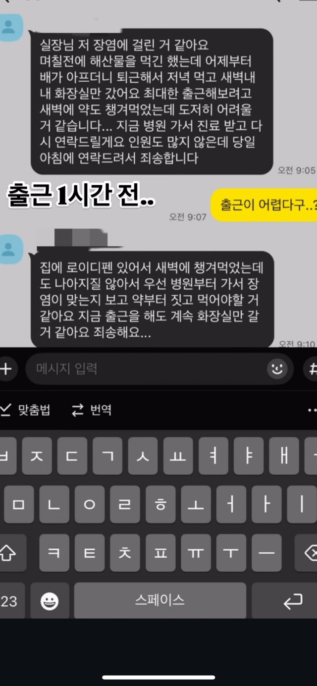 1. 출근 1시간 전 아프다고 거짓말하고 갑자기 결근통보