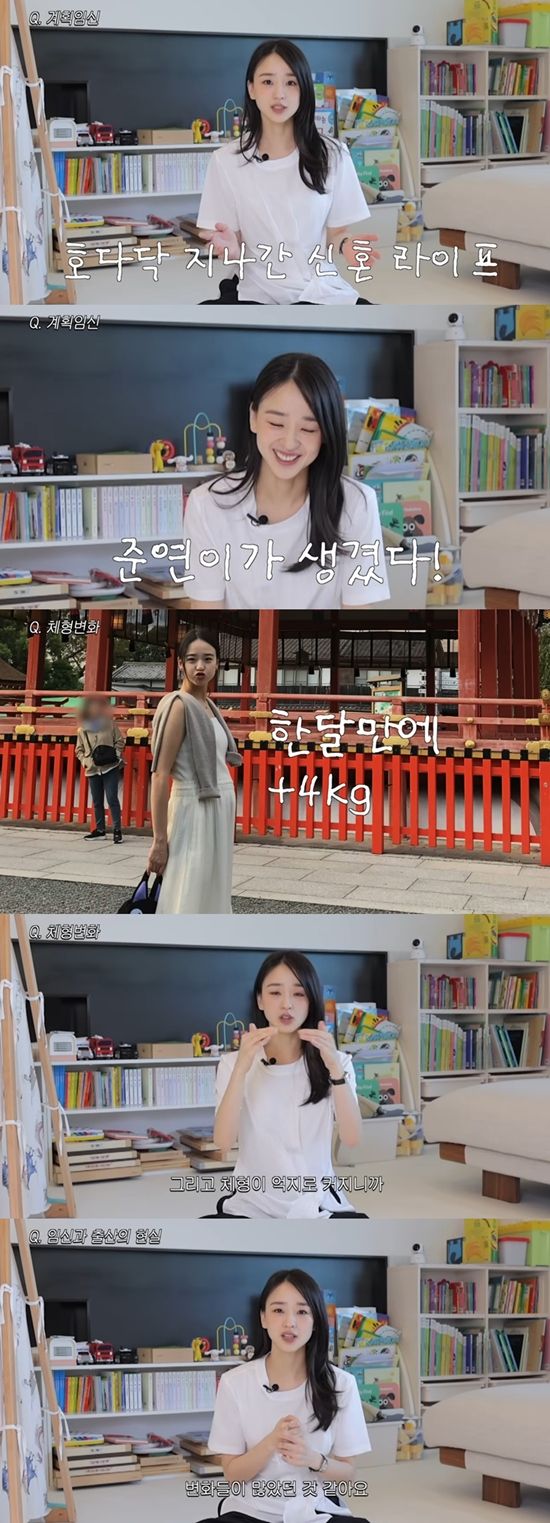 또한 손연재는 친한 임산부 지인과 태교 여행을 간 후 한 달 만에 4kg이 늘었다고 밝혔다. 이어 "살이 윤기 있게 찐다"라며 "체형이 억지로 커지니까 살이 터서 튼살 크림이란 크림은 다 발랐다"라고 털어놨다.