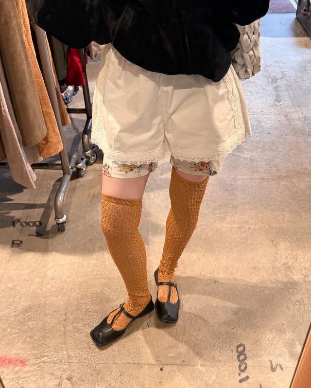 섹시하거나 캐주얼한 반바지 스타일링 말고 소녀미 넘치는 사랑스러운 룩을 선보인 오눅. 특유의 사랑스러운 빈티지 감성을 녹인 스타일은 그대로 따라하고 싶을 정도로 개성있고 웨어러블하다. 낙낙한 레이스 디테일 화이트 반바지에 머스터드 컬러의 니트 스타킹을 매치한 다음 T 스트랩 메리제인 슈즈를 매치한 오눅의 발랄한 룩은 각기 개성있는 아이템들의 절묘한 조합이 포인트다. 키워드는 ‘사랑스러움’. 각각의 아이템 하나하나 위시리스트에 올리고 싶을 정도다.