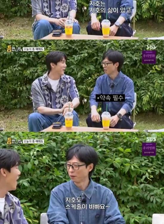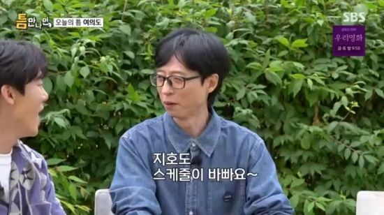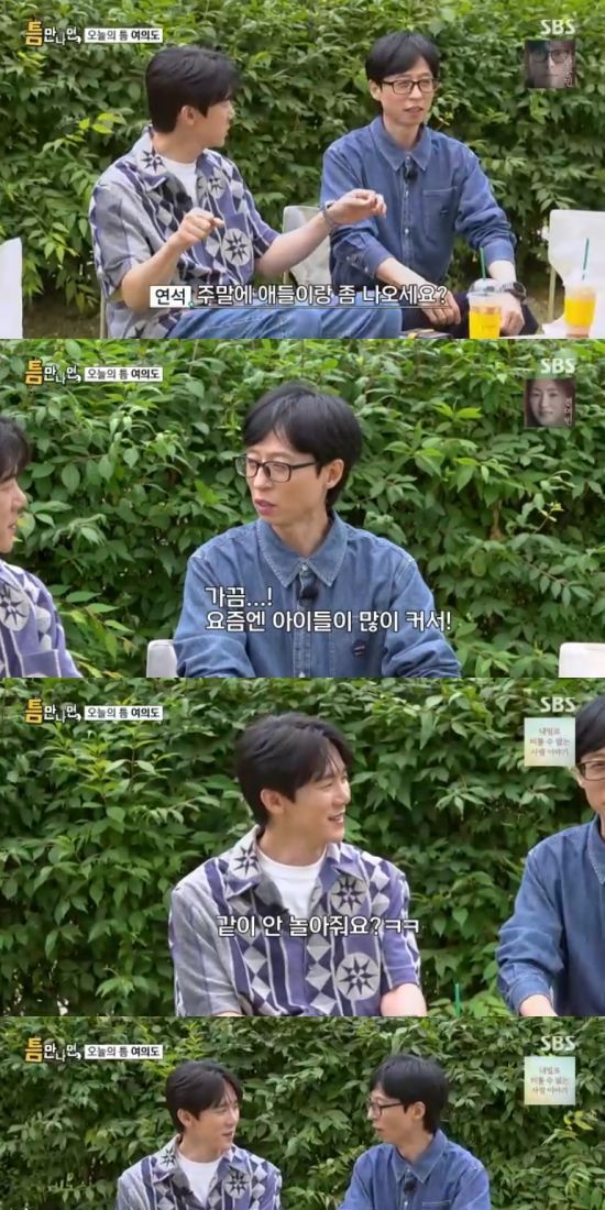 유연석은 한강 데이트에 대한 로망을 전하면서 아이들과 함께 하는 유재석의 주말 일상을 궁금해했다. 이에 유재석은 "아이들이 많이 커서 자끔 같이 보낸다. 지호는 이제 지호의 삶이 있다. 그래도 가족 식사 정도는 흔쾌히 참석을 한다. 만나려면 약속을 잡아야한다. 지호도 스케줄이 바쁘다"고 말해 웃음을 자아냈다.