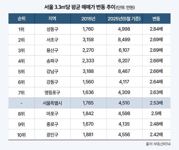 자치구별로 보면 상승폭이 가장 큰 곳은 성동구로, 3.3㎡당 평균 매매가가 1760만원에서 4998만원으로 2.84배 올랐다. 이어 서초구(2.69배), 용산구(2.69배), 송파구(2.66배), 강남구(2.66배), 강동구(2.64배)가 뒤를 이었다.
