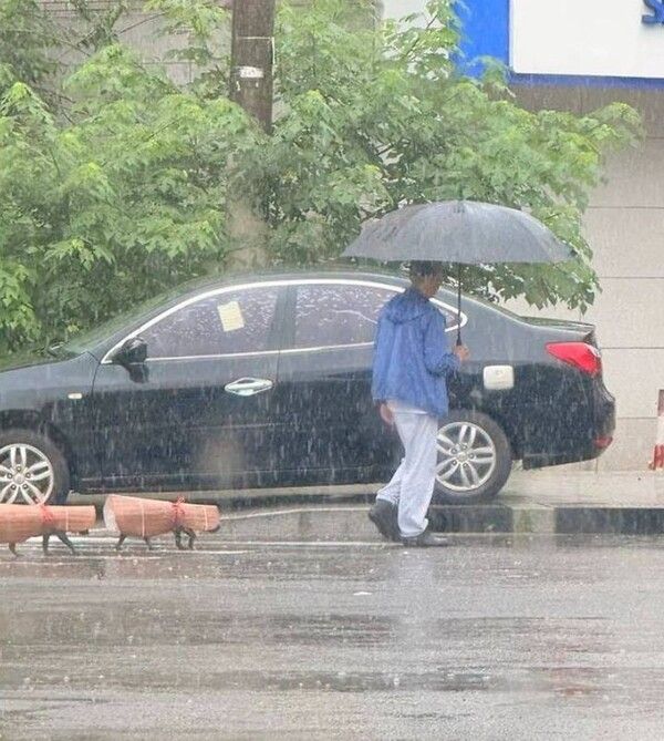 사진 속에는 비가 내리는 날 우산을 쓴 중년 남성의 뒤를, 돗자리를 뒤집어쓴 채 졸졸 따라가는 강아지 두 마리의 모습이 담겼다.