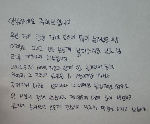 한편, 주학년은 성매매 의혹을 강력 부인했다. 그는 19일 자신의 인스타그램 스토리를 통해 자필 사과문을 공개했다. 주학년은 “기사나 루머에서 나오는 성매매나 그 어떠한 불법적인 행위도 한 사실이 전혀 없다”면서 “내 행동에 대해 깊이 반성하고 있으며 놀라셨을 분들께 진심으로 사과의 말씀을 드리고 싶다”고 말했다.