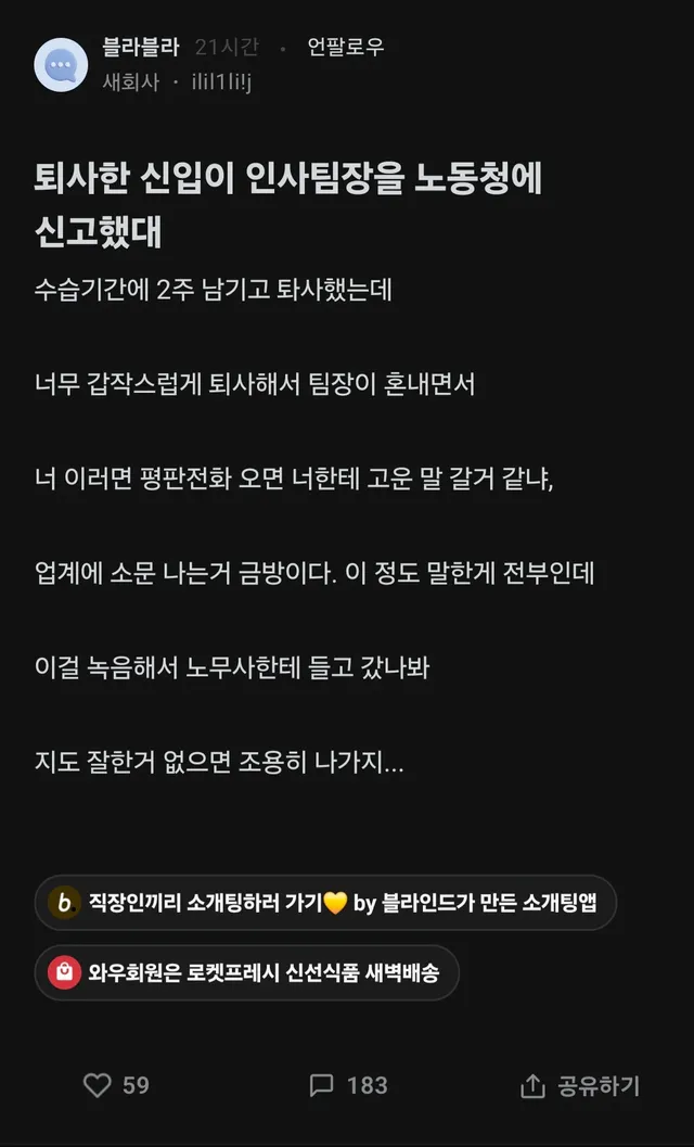 퇴사한 신입이 인사팀장을 노동청에 신고했대