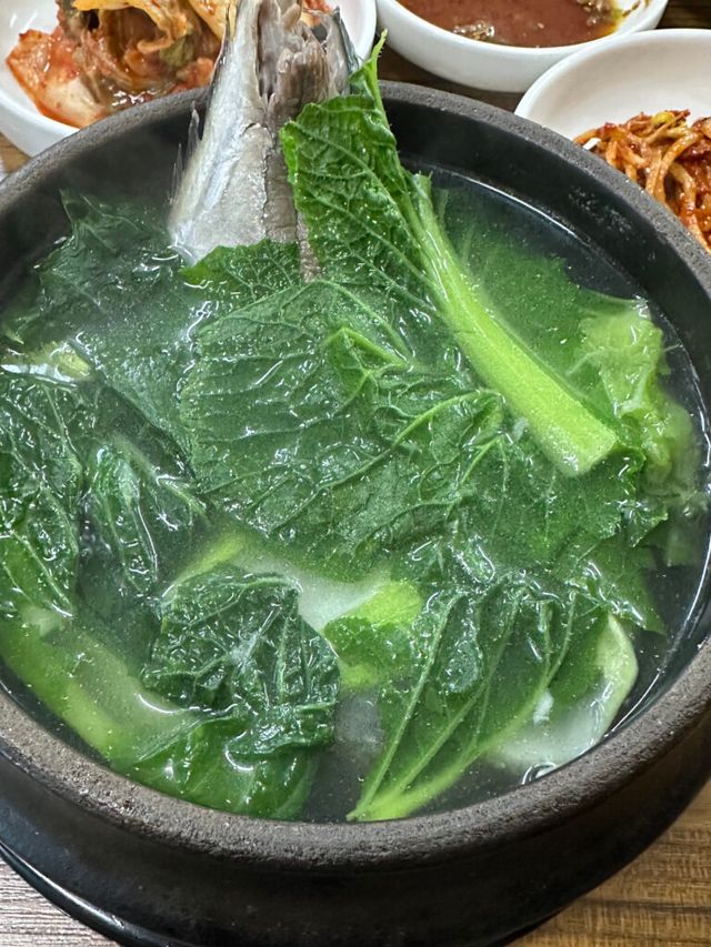 제주의 향토 음식이 궁금하다면 정성듬뿍 제주국을 방문해 보시기 바랍니다. 이곳의 시그너처 메뉴는 각재기 국인데요. 전갱이를 일컫는 각재기를 신선한 상태로 해장국처럼 끓여 낸 것입니다. 일반적으로 붉은빛을 띠는 해장국과 달리 이곳은 배춧잎이 가득한 맑은 국물이 포인트로 시원하면서도 슴슴한 맛이 일품입니다. 통통한 멸치를 튀긴 멜튀김도 곁들여 보세요.