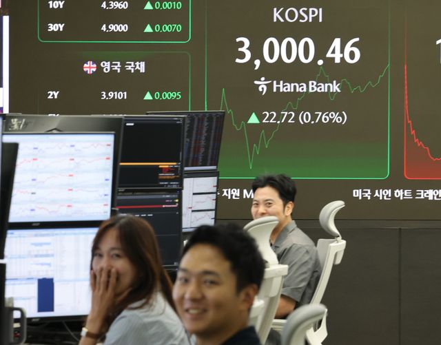 20일 오전 10시 45분 현재 코스피는 전장보다 22.72포인트(0.76%) 오른 3000.46이다. 한국거래소에 따르면 지수가 장중 3000선을 기록한 것은 지난 2022년 1월 3일(3010.77) 이후 3년 5개월여 만이다.