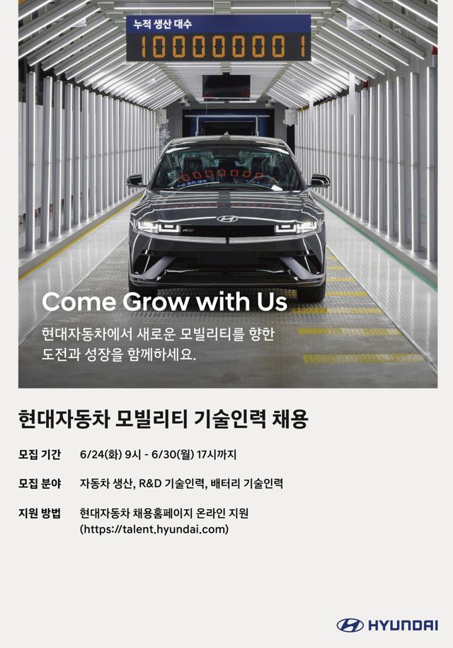 현대차는 전동화를 비롯한 미래 산업 트렌드에 적극적으로 대응하기 위해 다양한 역량과 전문성을 갖춘 모빌리티 기술인력을 선발할 계획이며, 서류 접수는 24일부터 30일까지 총 7일간 진행된다.