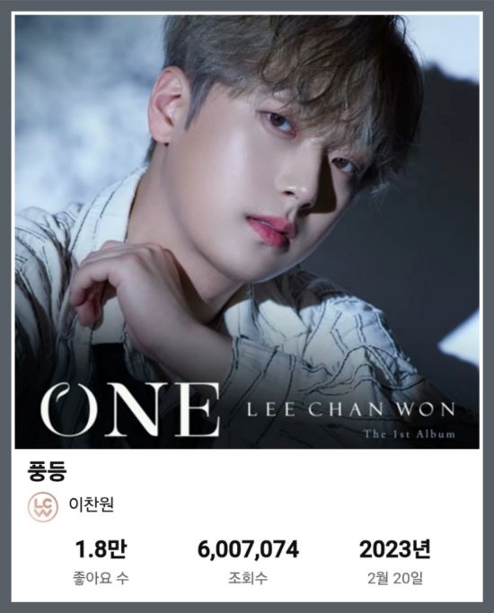 이찬원의 '풍등' 음원 영상은 최근 600만 스트리밍을 돌파했다. 이 곡은 이찬원의 첫 정규앨범 'ONE'의 타이틀곡으로, 공식 MV와 함께 2023년 2월 20일 공식 유튜브(일명 또튜브) 채널에 처음 공개됐다.
