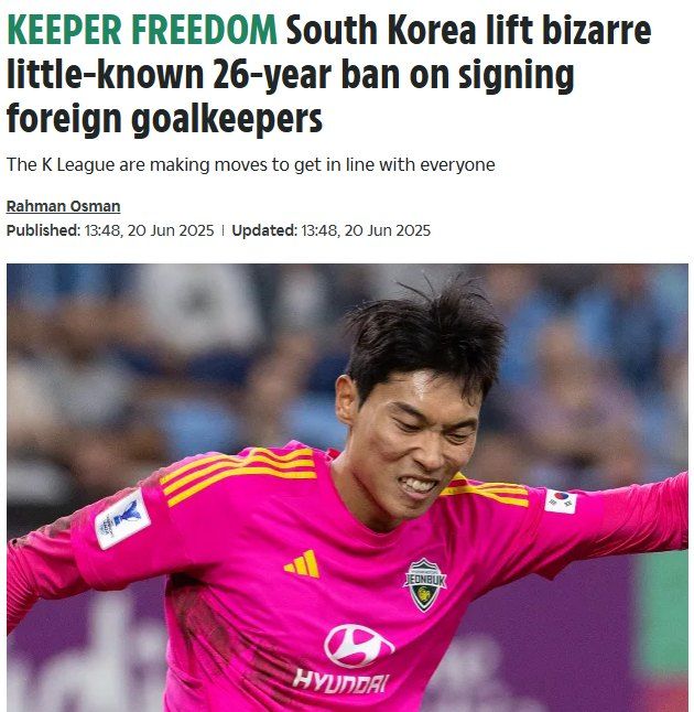 매체는 "한국 최고 축구 리그에서 외국인 골키퍼에 대해 26년간 이어진 출전 금지 조치가 2026년 시즌부터 삭제됐다"며 "1999년부터 아시아에서 가장 오래된 프로 국내 리그인 K리그에서 뛰는 것은 오직 한국 골키퍼 뿐이다"라고 밝혔다.