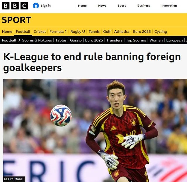 영국 공영방송 'BBC'는 20일 "K리그가 외국인 골키퍼 출전 금지 규정을 폐지했다"라며 "외국인 골키퍼 영입 금지가 27년 만에 해제돼 내년부터 외국인 골키퍼는 K리그에서 뛸 수 있게 됐다"라고 보도했다.
