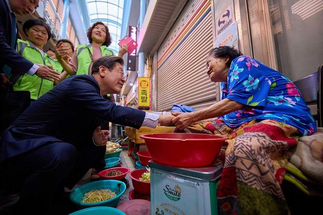 시장에 들어선 이 대통령은 한 분식집에 들러 부추전, 고추튀김, 떡볶이, 순대 등을 직접 구입했다. 인근 가게에서는 식혜와 증편떡도 사 참모진과 함께 나눠 먹었다. 시장 상인들과 시민들은 이 대통령을 반갑게 맞았다. 일부 시민은 "캐나다 순방에서 고생 많았다", "여사님 모습도 보기 좋았다", "건강을 꼭 챙기며 일해달라"는 등의 말로 이 대통령을 격려했다.
