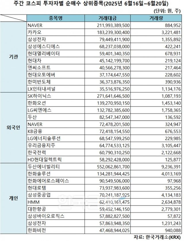 기관 'NAVER'·외인 'SK하이닉스'·개인 '두산에너빌리티' 1위 [주간 코스피 순매수- 2025년 6월16일~6월20일]
