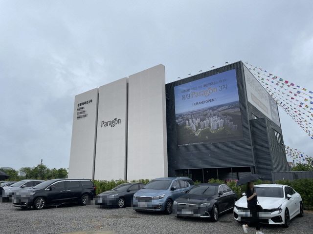 장마철에 접어들어 폭우가 쏟아진 '동탄 파라곤 3차' 견본주택 오픈 첫날(20일). 강한 비가 내리는 평일 오후임에도 동탄2신도시에서 마지막으로 공급되는 대단지 민간임대 아파트의 상품성을 직접 확인해보기 위한 방문객들의 발길이 이어졌다. = 박선린 기자