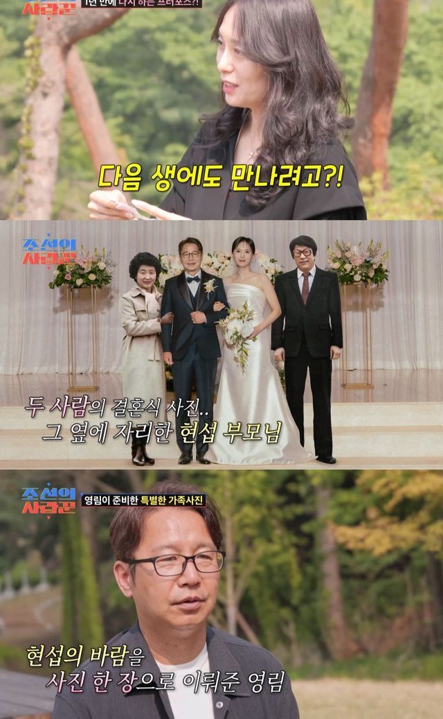 산소에서 문안 인사를 마친 심현섭은 “엄마하고 비슷한 며느리를 만나게 해주신 것 너무 고맙다”라며 아내에 대한 애정을 드러내는 한편 정영림에게 그간 서운했던 일들을 고자질(?)해 웃음을 자아냈다. 이후 심현섭은 반지 케이스 안에 반지 대신 편지를 넣어 능청스럽게 마음을 전달했다. ‘다음 생에는 좀 일찍 받아달라’는 농담 가득한 내용에, ‘아내’ 정영림은 “다음 생에도 만나려고?”라며 폭소했다. 이윽고 정영림도 깜짝 선물을 전달했다. 선물은 두 사람의 결혼사진에 작고한 심현섭의 부모님 모습을 합성한 액자였다. 예상 못 한 선물에 심현섭은 받자마자 말문을 잃었다. 사진 속의 부모님은 현재의 심현섭보다 젊은 모습이었지만, 김국진은 “그래도 부모님이라는 게 느껴지지 않냐”며 감동했다. 심현섭은 “본식 때, 부모님이 혼주로서 함께 계셨으면 좋았겠다는 희망을 이 사진 한 장으로 영림이가 이루어 줬다. 솔직히 말씀드리면, 영림을 만난 1년 동안 오늘이 제일 예쁘고 고마웠다”고 제작진에게 속마음을 밝혔다.