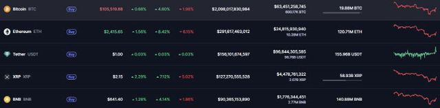 25일 글로벌 가상자산 시황중계 사이트 코인마켓캡에 따르면 이날 오전 8시 10분 기준 비트코인 가격은 24시간 전 대비 4.6% 오른 10만 5519달러를 기록했다. 일주일 전과 비교하면 1.98% 하락했다. 알트코인(비트코인 외 가상자산)의 대표격인 이더리움은 전일 대비 8.42% 상승한 2415달러에 거래됐다.