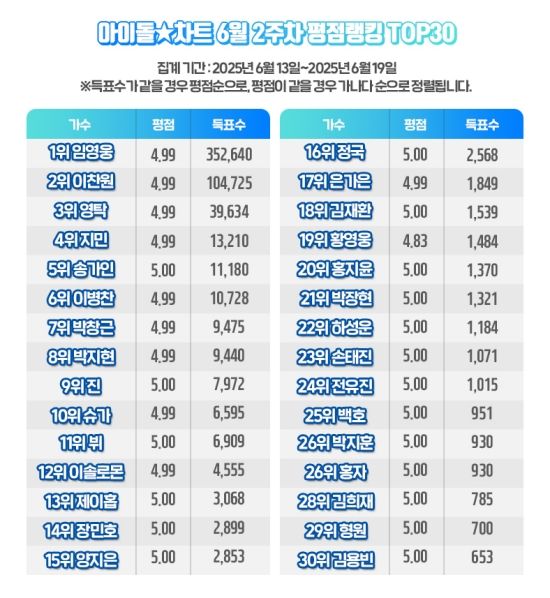 최근 아이돌차트는 임영웅이 6월 13일부터 6월 19일까지 집계된 6월 2주 차 평점랭킹에서 35만 2,640표를 얻어 최다 득표를 기록했다고 밝혔다.