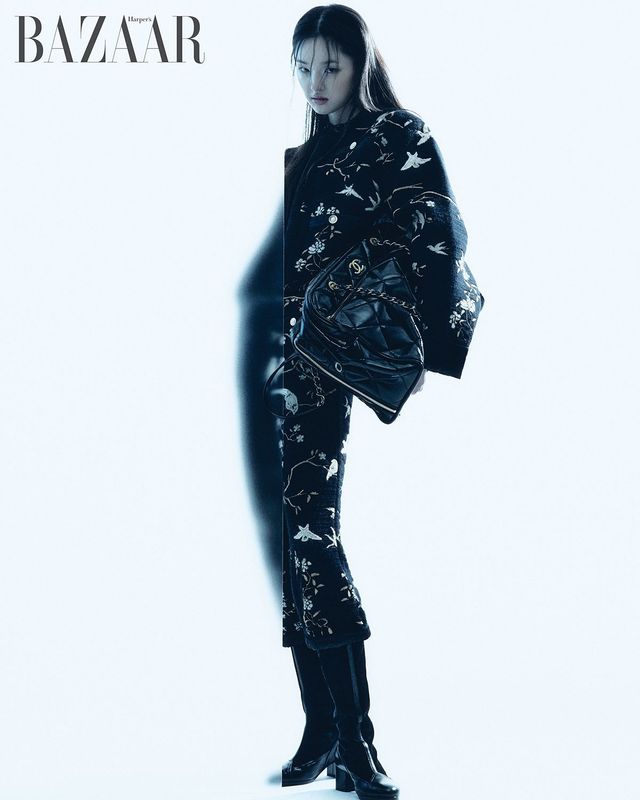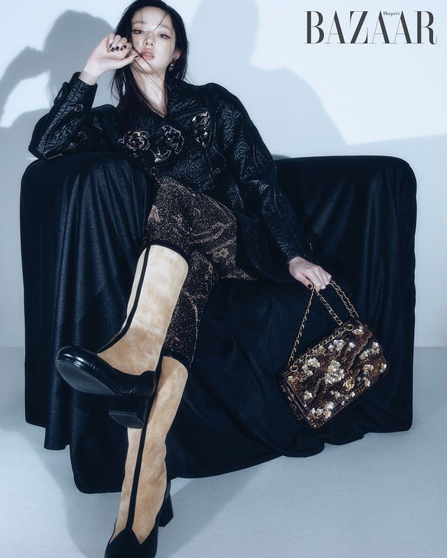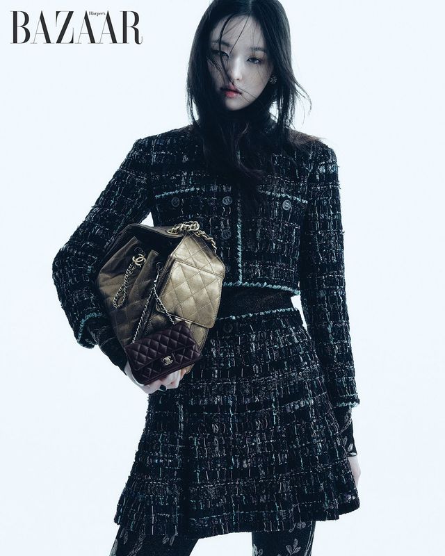 트위드 재킷·스커트 세트업, 이너로 입은 풀오버, 타이츠, 귀고리, 골드 톤 메탈 버전의 ‘샤넬25’ 스몰 핸드백, 백참으로 연출한 클래식 미니 백은 모두 Chanel.