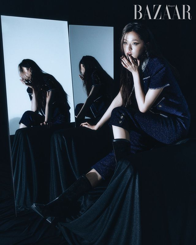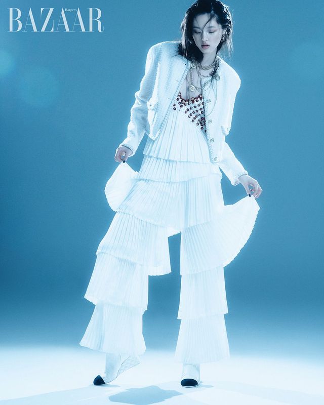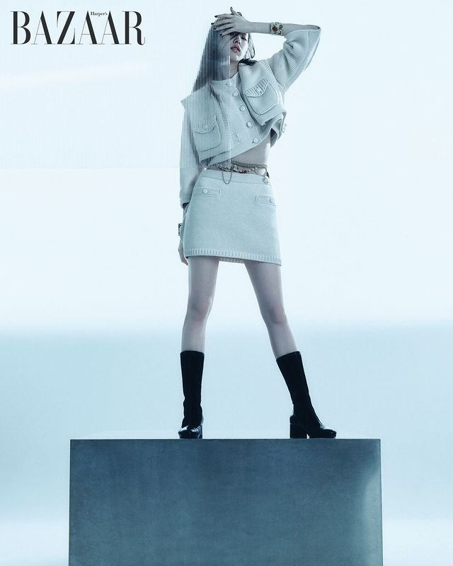 니트 베스트, 크롭트 재킷, 스커트, 귀고리, 양팔에 착용한 커프, 체인 벨트, 부츠는 모두 Chanel.