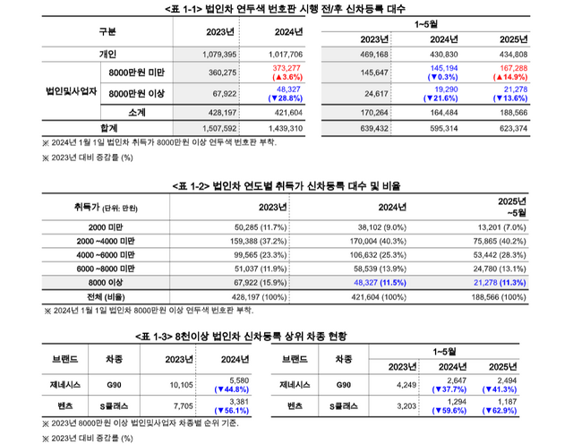 올해도 1~5월까지 신차 등록된 8000만원 이상 법인차 비율은 2023년 동기 대비 13.6% 감소했다. 특히 전체 법인차 중 8000만원 이상 법인차 비율은 2024년 11.5%로 낮아졌으며 2025년에는 11.3%로 더 낮아졌다.