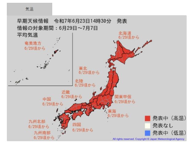 같은 날 한국경제 보도에 따르면 일본 기상 협회 날씨 예보 전문 매체 '덴키'는 이날 일본이 오키나와를 제외한 일본 전국 각지, 즉 홋카이도부터 규슈·아마미 지방에 ‘고온에 관한 조기 날씨 정보’를 발령했다고 전했다. 이 조치는 약 1주 뒤부터 2주일 후까지 5일 평균 기온이 평소보다 '상당히 높음'이거나 '상당히 낮음'이 될 확률이 30% 이상일 때 발표된다.