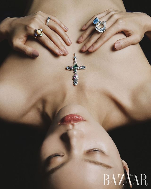 왼손 검지의 오팔·랩 사파이어·아콰마린 세팅 반지는 24만원, 약지의 실버 반지는 15만원, 오른손 중지의 하트 모티프 크리스털 세팅 반지는 30만원, 약지의 랩 오팔 세팅 반지는 28만원, 랩 에메랄드·랩 사파이어·랩 루비를 세팅한 십자가 펜던트는 1백만원 모두 Diligems.