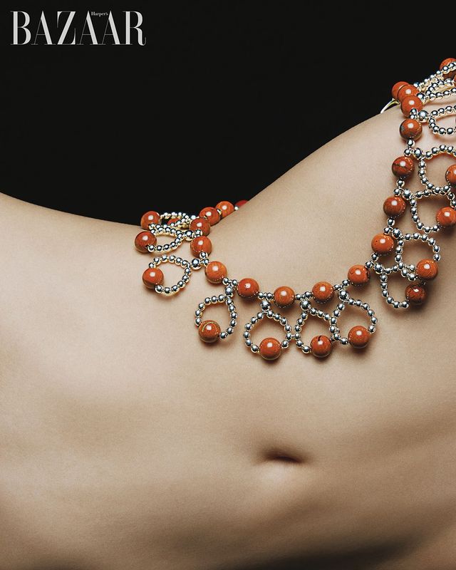 레드 재스퍼와 헤마타이트 원석을 장식한 ‘레인’ 목걸이는 1백35만원 Scho Jewelry.
