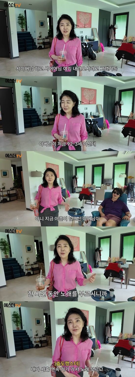 "잘 쉬셨냐"는 제작진의 말에 여에스더는 "잘 쉴 수가 없었다. 얼마 전에 시어머니 생신이었다. 그래서 시아버님, 시어머님을 여기에 내려오시라고 했다. 그런데 내가, 시아버님이 나를 좋아한다는 것을 깜박한 것이다"라고 말을 이었다.