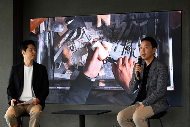 | 문정균 제네시스공간경험실 실장(왼쪽)과 조성호 작가가 ‘제네시스 청주’ 미디어 투어에서 대화하고 있다. (사진=제네시스) |