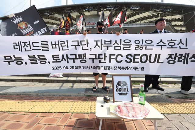 FC서울 떠나는 기성용…들끓는 팬심 (서울=연합뉴스) 김성민 기자 = FC서울 팬들이 29일 서울 마포구 서울월드컵경기장 앞에서 '무능 불통 구단 FC서울 장례식' 기자회견를 열고 있다. 2025.6.29 ksm7976@yna.co.kr/2025-06-29 16:26:50/ <저작권자 ⓒ 1980-2025 ㈜연합뉴스. 무단 전재 재배포 금지, ai 학습 및 활용 금지>