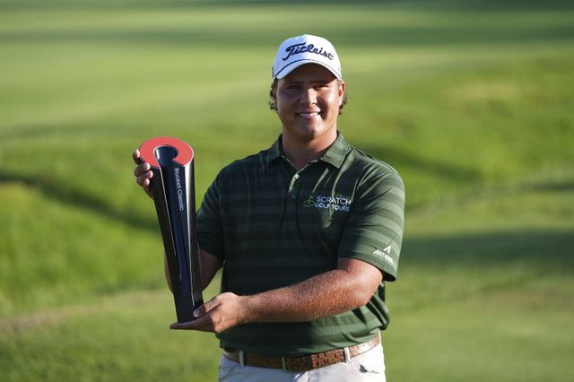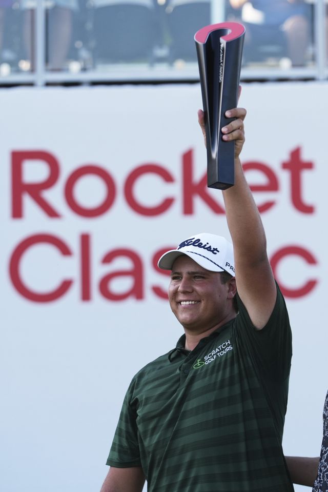 Aldrich Potgieter, of South Africa poses with the trophy after winning a playoff during the final round of the Rocket Classic golf tournament at the Detroit Golf Club, Sunday, June 29, 2025, in Detroit. (AP Photo/Paul Sancya)/2025-06-30 09:00:45/ <저작권자 ⓒ 1980-2025 ㈜연합뉴스. 무단 전재 재배포 금지, ai 학습 및 활용 금지>