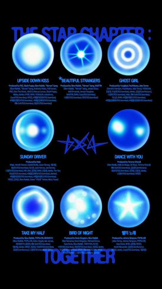 투모로우바이투게더는 1일 0시 팀 공식 SNS에 정규 4집 '별의 장: TOGETHER'의 트랙 리스트를 게재했다. 이번 앨범에는 타이틀곡 '뷰티풀 스트레인저스'를 포함해 '업사이드 다운 키스(Upside Down Kiss)', '고스트 걸(Ghost Girl)', '선데이 드라이버(Sunday Driver)', '댄스 위드 유(Dance With You)', '테이크 마이 하프(Take My Half)', '버드 오브 나이트(Bird of Night)', '별의 노래' 등 총 8곡이 수록된다.