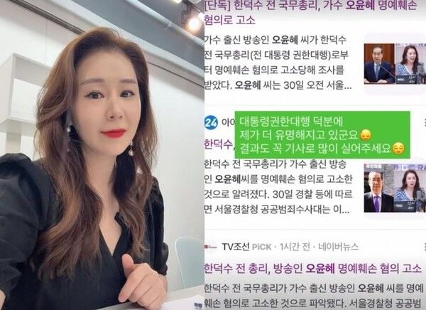 함께 공개한 사진에는 포털사이트에 올라온 '한덕수 전 총리, 방송인 오윤혜 명예훼손 혐의 고소' 관련 뉴스가 담겼다.