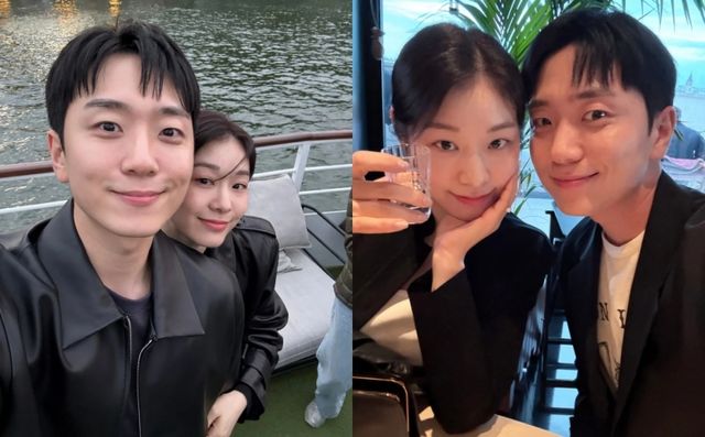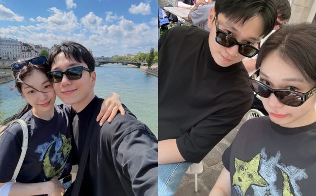 블랙 가죽 재킷을 입고 커플룩을 연출하는가 하면 또 다른 사진에서는 센 강을 배경으로 포즈를 취하며 로맨틱한 분위기를 연출했다.