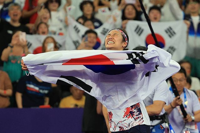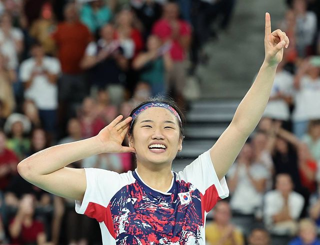 대한민국 배드민턴 대표팀 안세영 선수가 지난해 8월 3일(한국시간) 프랑스 파리 라 샤펠 아레나에서 열린 2024 파리올림픽 배드민턴 여자 단식 준준결승 일본 아카네 야마구치 선수와의 경기를 승리한 후 기뻐하고 있다 / 뉴스1