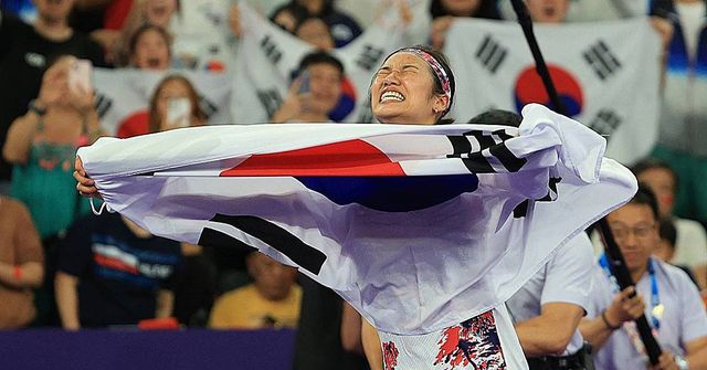 대한민국 배드민턴 대표팀 안세영이 지난해 8월 5일 오후(한국시간) 프랑스 파리 라 샤펠 아레나에서 열린 2024 파리올림픽 배드민턴 여자 단식 결승 중국의 허빙자오 선수와의 경기에서 금메달을 확정 지은 후 기뻐하고 있다 / 뉴스1