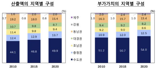 또한 수도권이 차지하는 부가가치 비중 역시 지난 2015년 대비 3.3%포인트 늘어난 54%를 차지했다. 2015년 당시 전기인 2010년보다 다소 하락하며 주춤했지만 재차 상승 전환한 셈이다.