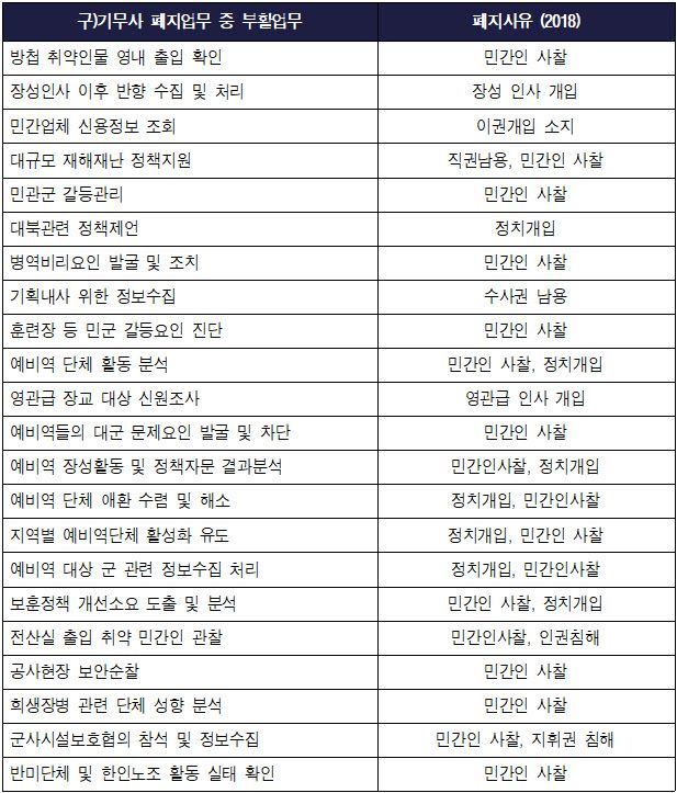 이외에도 방첩사는 △대규모 재해재난 정책지원 △공사현장 보안순찰 △군사시설보호협의회 참석 및 정보수집 △보훈정책 개선소요 도출 및 분석 등의 업무를 수행한 것으로 파악됐다. 민간인 사찰에 해당하는 ‘임무’다.