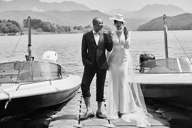 흑백으로 처리된 요트 위 사진부터 반려견들과 함께한 밝은 야외 컷까지 마치 로맨틱한 독립영화를 보는 듯한 감각적인 연출이 시선을 사로잡는다. 또 웨딩드레스와 청바지, 턱시도와 수트 등 자유로운 콘셉트가 어우러지며 개성 넘치는 커플의 매력이 고스란히 느껴진다.