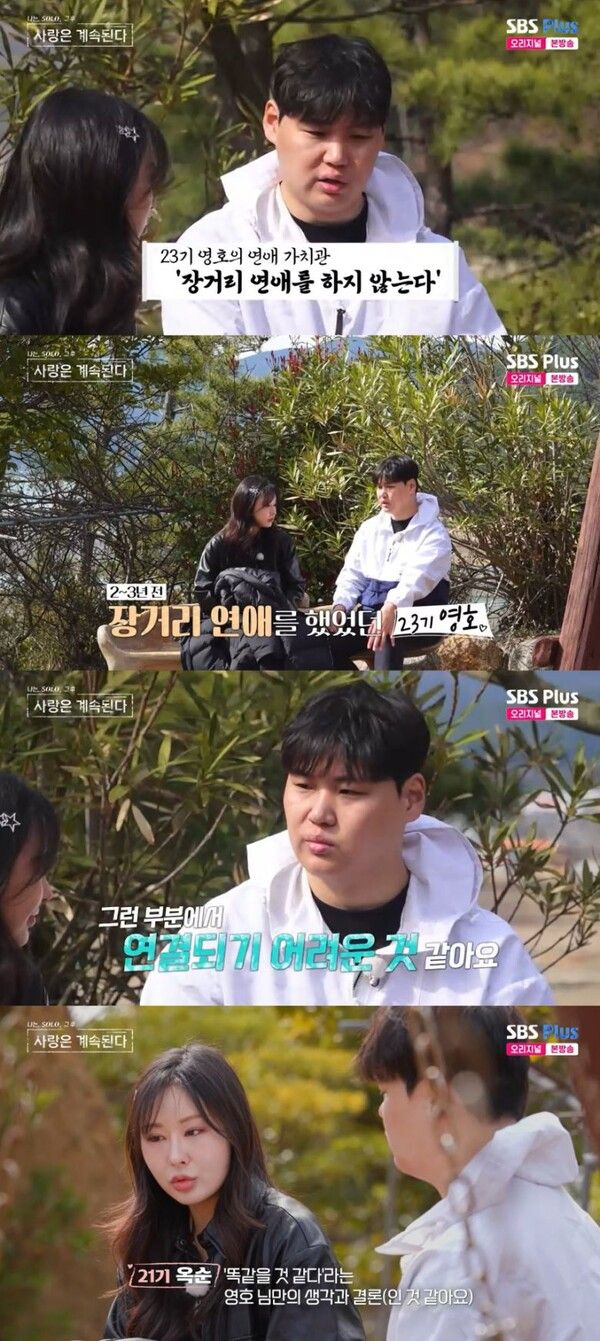 [메디먼트뉴스 김수현 기자] '나는 SOLO, 그 후 사랑은 계속된다'(이하 '나솔사계')에서 21기 옥순이 23기 영호에게 진심을 고백했지만, 영호가 '수도권 거주'라는 현실적인 조건을 내세우며 끝내 마음을 거절했다. 옥순은 눈물을 보이며 안타까움을 더했다.