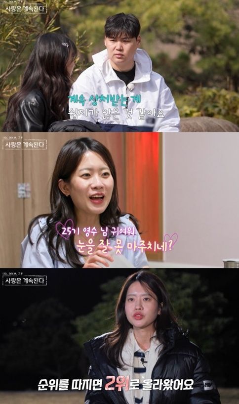 비슷한 시각, 24기 정숙은 24기 영수와 ‘사계 데이트’를 한 뒤 곧장 25기 영수와 ‘사계 데이트’를 이어갔다. 식당에 들어간 24기 정숙은 25기 영수에게 “귀엽다. 제 눈을 잘 못 마주치네?”라며 지그시 바라봤다.