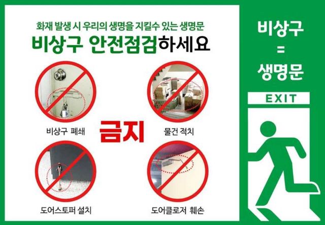 비상구를 막는 행위는 단순한 부주의나 관리 소홀의 문제가 아니라, 화재나 재난 발생 시 인명 피해를 급증시키는 생명 위협 행위다. 과거 제천 스포츠센터 화재, 군산 대가유흥주점 화재, 인천 호프집 화재 등에서도 비상구 폐쇄로 인해 다수의 인명 피해가 발생한 바 있다. 이러한 사례는 비상구가 단순한 통로나 출입구가 아닌, 재난 시 대피를 위한 생명의 문이라는 점을 상기시킨다.