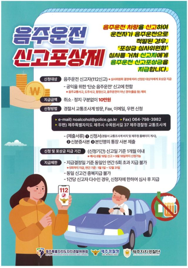 제주경찰청과 자치경찰단은 음주 운전 단속 결과를 신고자에게 통보하는 과정에서 포상금 제도도 함께 안내하도록 개선했다고 밝혔다. 앞으로는 제도 홍보와 신청 절차 안내를 더욱 강화해, 신고자가 정당한 권리를 보장받도록 할 방침이다.
