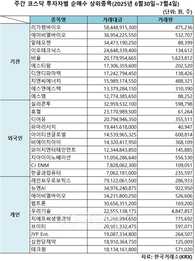 기관 '리가켐바이오'·외인 '실리콘투'·개인 '레인보우로보틱스' 1위 [주간 코스닥 순매수- 2025년 6월30일~7월4일]