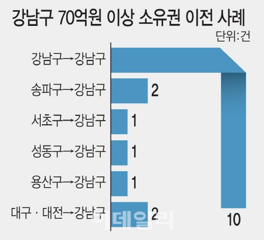6일 이데일리가 올해 들어 6월 말까지 국토교통부 실거래가 시스템에 등록된 서울 강남구 70억원 이상 고가 아파트 거래에서 소유권 이전 등기가 완료된 20건 중 소유권 일부만 이전된 사례를 제외한 17건을 분석한 결과 강남3·용산구 내에서 강남구 최상급지로 이동한 사례가 14건으로 집계됐다. 강남구에서 강남구로 이동한 사례도 10건이나 됐다.