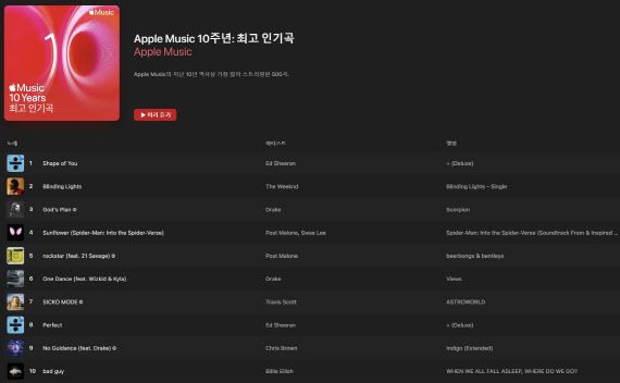 애플뮤직은 서비스 출시 10주년을 맞아 지난 10년간 전 세계 애플뮤직에서 가장 많이 스트리밍된 노래 500곡을 7일 공개했다.