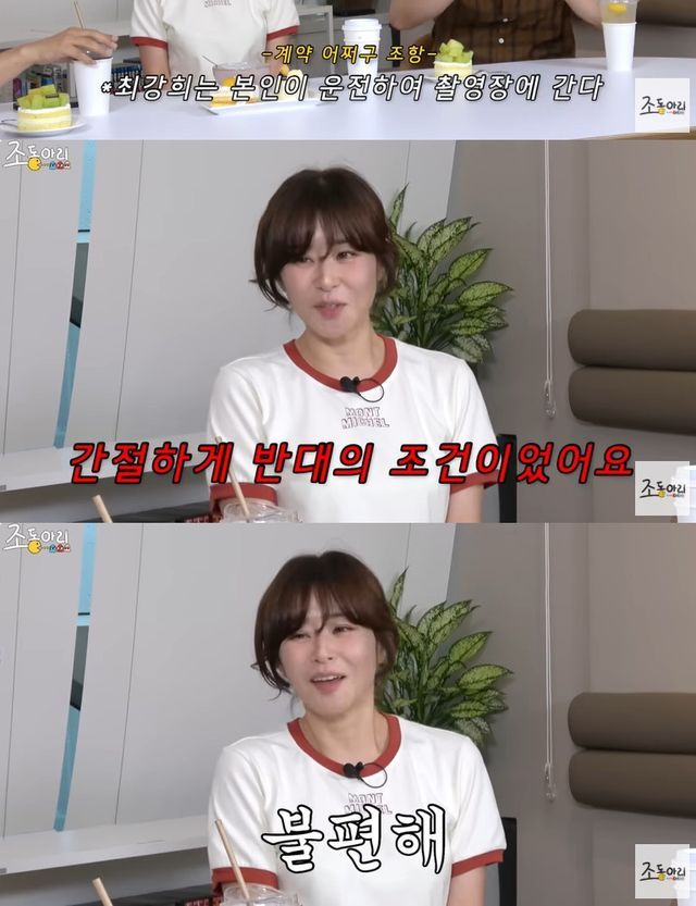 이에 김수용이 "녹화장도 다 본인이 운전해서 다닌다"고 하자 지석진은 "(송)은이랑 계약한 거 아니냐"며 의아해했고, 미디어랩시소로 소속사가 같은 김수용은 "계약 조건에 '최강희는 본인이 운전해서 촬영장에 간다'가 있다"고 말해 모두를 놀라게 했다.