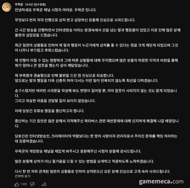 ▲ 왁제이맥스 관련 문제에 대한 우왁굳의 사과문 (자료출처: 우왁굳 유튜브 채널)