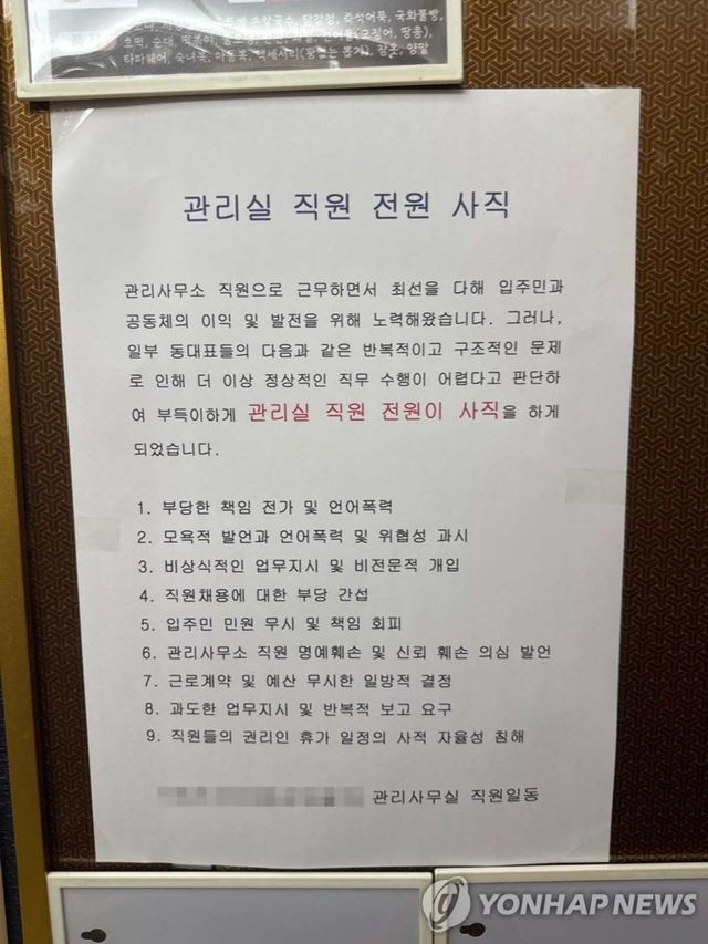 지난 7일 연합뉴스 등에 따르면 해당 사건은 일부 동대표들의 반복적이고 구조적인 갑질로 인해 관리사무소 직원들이 더 이상 정상적인 직무 수행이 불가능하다고 판단하여 단체로 사직서를 제출하면서 시작된 것으로 파악됐다.