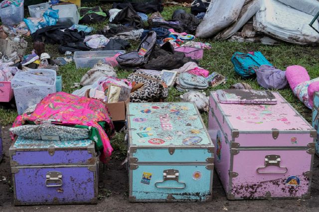 7일 미스틱 캠프 앞에 놓인 어린이 물품들. (사진=Getty Images/AFP)