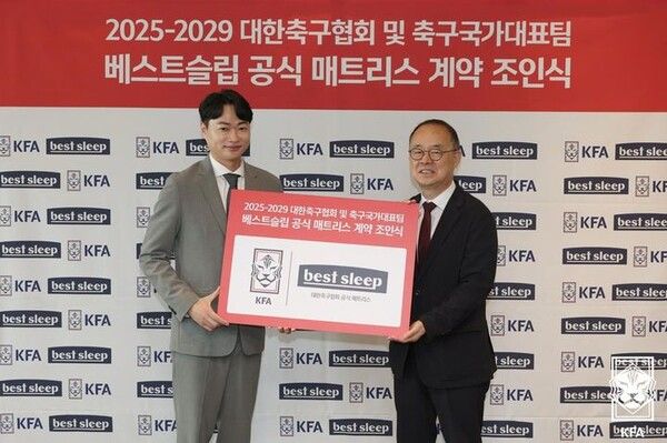 공식 협찬 계약 체결을 위한 조인식은 지난달 19일 이용수 대한축구협회 부회장과 김승희 전무, 베스트슬립 서진원 대표 등이 참석한 가운데 서울 종로구 축구회관에서 진행됐다.